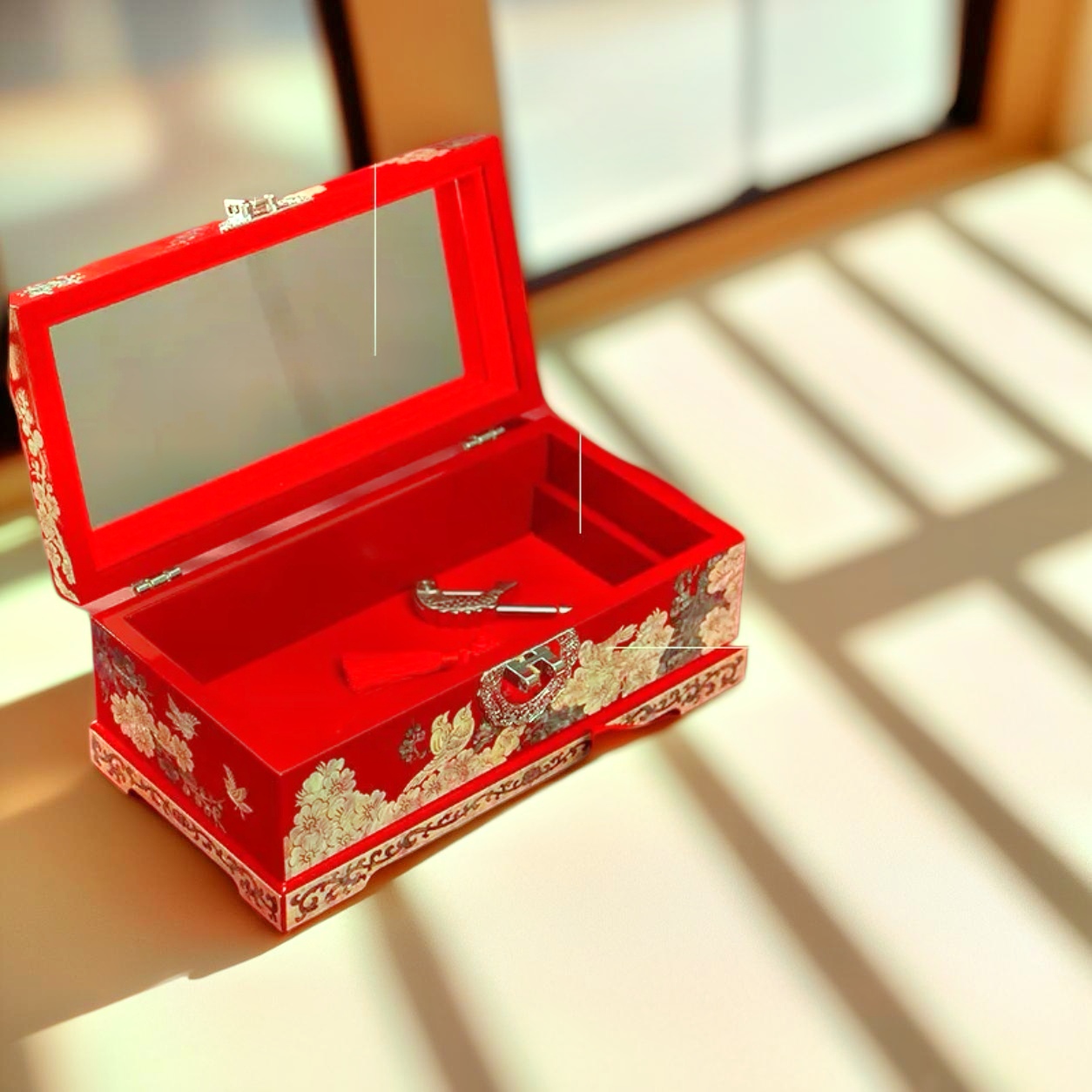 Red-size, 24.5*13*9.5design with the theme of "Joy Reigns Supreme on the Branches" and a fish-shaped lock with a shell bottom.